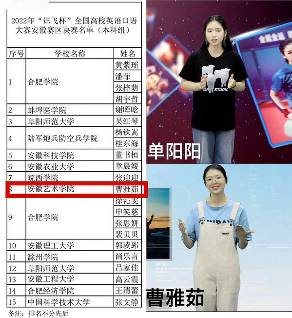 10月19日,为期3个月的“讯飞杯”全国高校英语口语大赛安徽赛区本科组复赛正式落下帷幕,美术学院曹雅茹同学晋级11月初举行的省赛决赛,戏剧学院单阳阳同学获复赛三等奖。