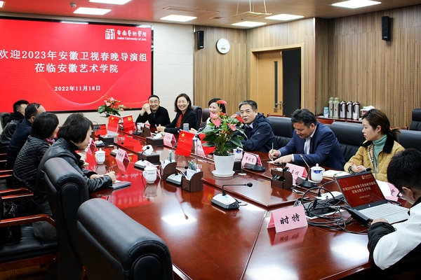 11月18日上午,安徽广播电视台文体中心总监葛晓,安徽卫视2023年春晚总导演胡明明、舞蹈总监姜洋、制片主任许平一行来校洽谈校青年舞团参演安徽卫视2023年春晚事宜。党委委员、副校长柳友荣参加接待。党委委员、办公室主任曹晓富,党委委员、宣传(统战)部部长王琍琍陪同。