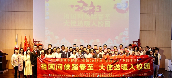 1月17日,中国驻菲律宾使馆举办“祖国问候踏春至,大使送暖入校园”2023年“温暖迎春”慰问留学生活动,我校发展规划与科研处副处长张祖顺担任活动主持人,并同音乐学院青年教师谢潘婕一起再次唱响《领航》,受到中国驻菲律宾共和国特命全权大使黄溪连和在场观众的高度评价。