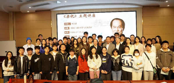 何占豪先生讲述其创作小提琴协奏曲《梁山伯与祝英台》(简称《梁祝》)主题旋律时的创意与构思,阐释《梁祝》将传统戏曲的过门、唱腔音乐作为音乐素材提炼于主题旋律的过程。半个世纪以来,何占豪始终倡导音乐创作不仅要“民族化”,还要兼顾“群众化”,秉持“外来形式民族化、民族音乐现代化”的创作理念。讲座富有感染力,在座师生受益匪浅。