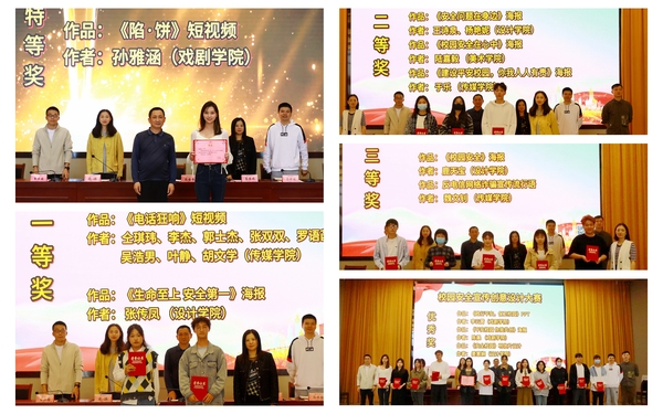 高英娟宣读获奖名单。孙雅涵的短视频《陷饼》获特等奖,仝琪玮、李杰的短视频《电话狂响》和张传凤的海报《生命至上 安全第一》获一等奖;王诗泉、杨艳妮的海报《安全问题在身边》,陆嘉毅的海报《校园安全在心中》和于乐的海报《建设平安校园,你我人人有责》获二等奖;黄欣羽的表情包《反诈,你我一路同行》,李文博的短视频《套中人》,倪雯雯的海报《平安校园,美好未来》,鹿天宝的安全宣传海报和魏文钊的《反电信网络诈骗宣传流行语》获三等奖;15组作品获优秀奖。