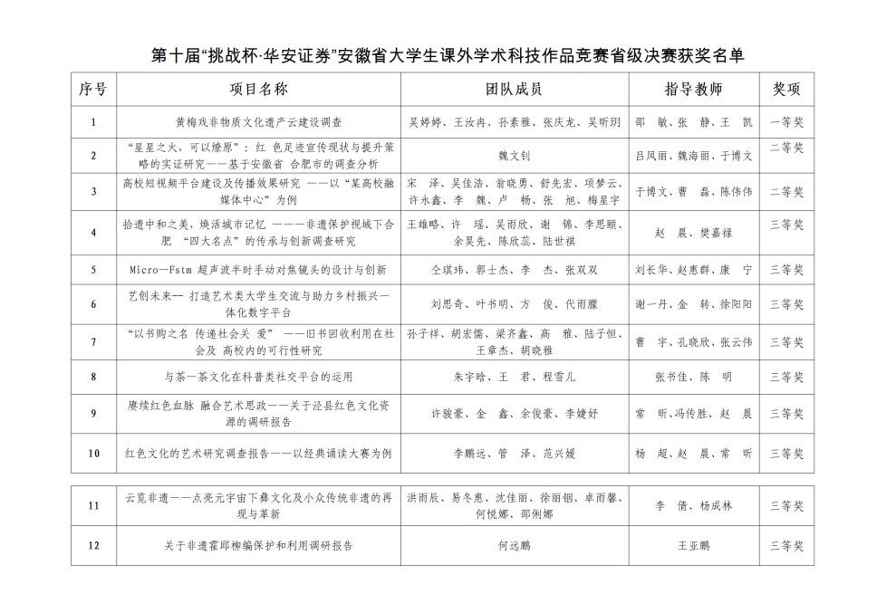 近日,第十届“挑战杯·华安证券”安徽省大学生课外学术科技作品竞赛终审决赛在安徽理工大学圆满结束。我校《黄梅戏非物质文化遗产云建设调查》等多个项目参加决赛,喜获一等奖1项、二等奖2项、三等奖9项(详见获奖名单)。