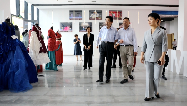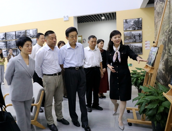 谢广祥一行先后观看设计学院“礼敬中华传统文化”手工劳动坊艺术展、传媒学院张崇岫抗美援朝战地摄影展、音乐学院乐动网官网管乐团演奏的乐曲《蓝色山脉传奇》。