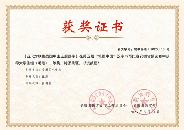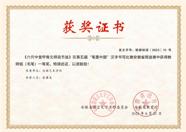 在安徽省语言文字工作委员会、安徽省教育厅主办的第五届“笔墨中国”汉字书写比赛安徽省预选赛中,我校“双百人才”、书法研究所所长、美术学院书法学专业负责人张典友获教师组一等奖,入围全国决赛。美术学院2022级绘画(国画)专业本科生张燕获大学生组二等奖,查家欣、毛思漩获大学生组优秀奖。