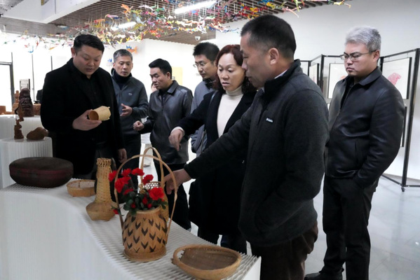 座谈会前,樊嘉禄陪同指导组一行参观了设计学院非遗专业师生优秀作品展、洪建华徽州竹雕大师工作室和徽州竹雕艺术实践中心。
