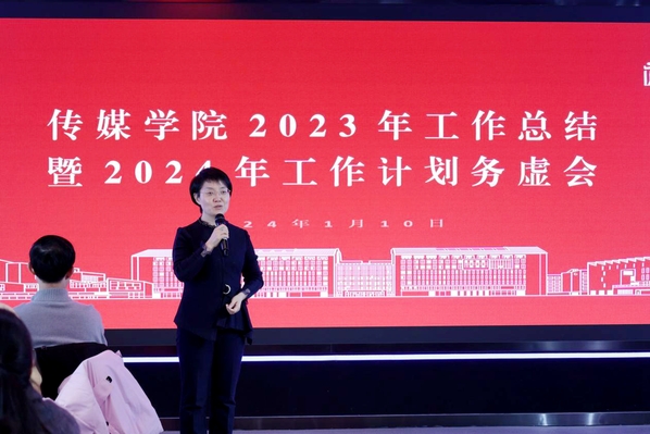 传媒学院党总支书记、院长蔡正兰以“动车组”为喻,鼓励传媒学院每名教职工在2024年继续精诚合作、全力发动,实现更好更快发展的目标。
