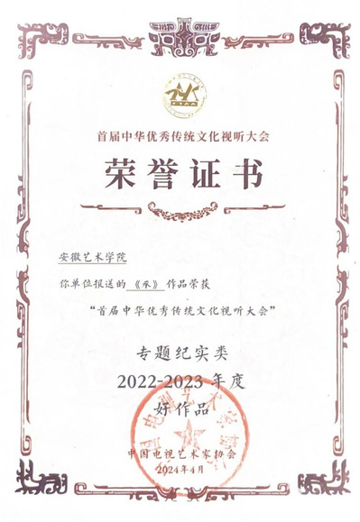 4月20日,首届中华优秀传统文化视听大会在江苏南京举行,我校出品的纪实片《承》从1513部作品中脱颖而出,获评人文纪实类“2022—2023年度好作品奖”,是安徽省高校中唯一一部获奖作品。