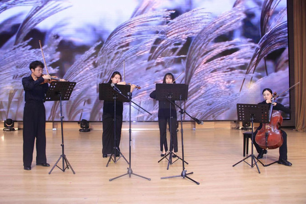 民进会员、音乐学院副教授汪伊珺与三位弦乐演奏者共同演奏了弦乐四重奏《在水一方》。旋律优美经典,与诵读会主题完美融合,充分展示了作品的魅力。