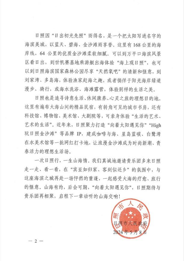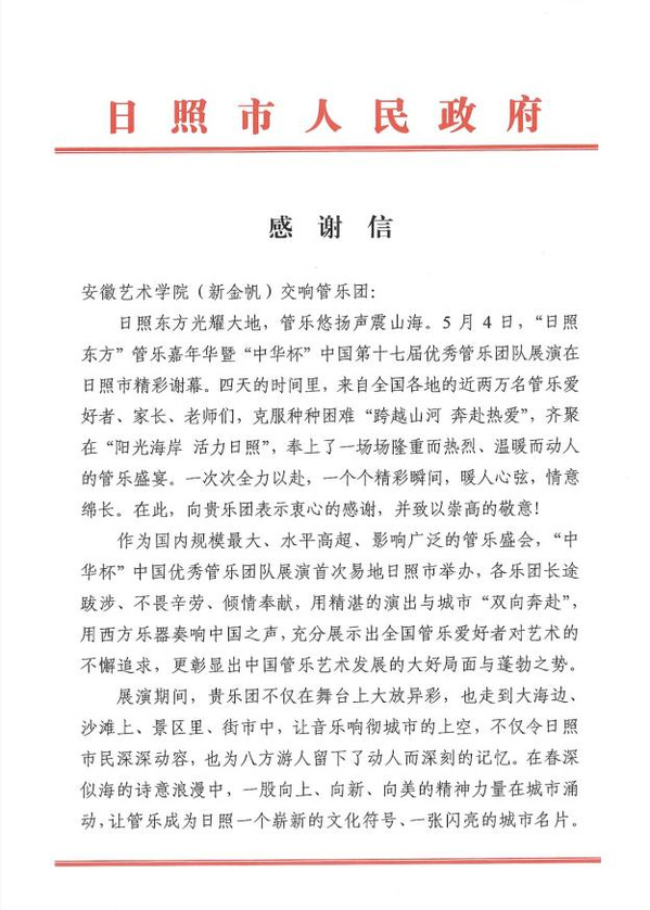 近日,日照市人民政府向乐动网官网(新金帆)交响管乐团发来感谢信。