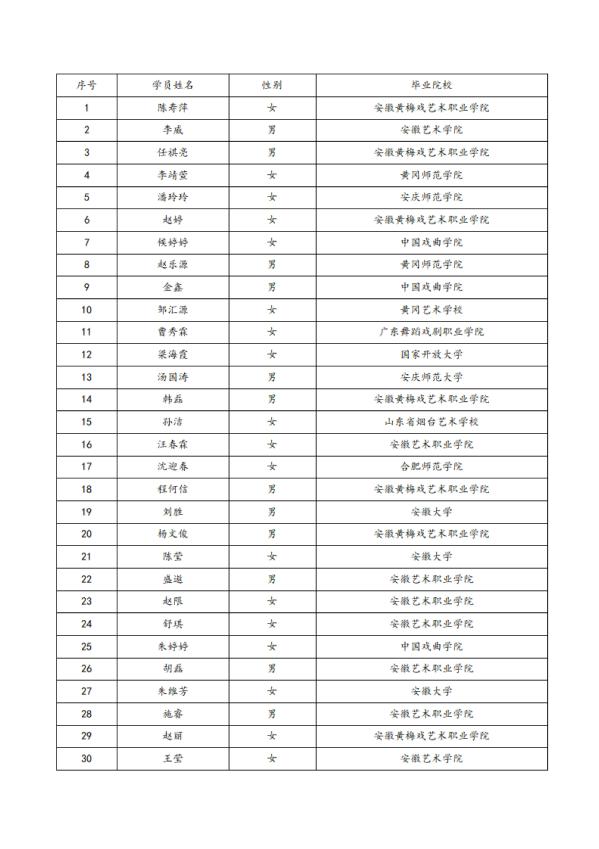 根据《国家艺术基金项目资助管理办法》《国家艺术基金资助项目监督管理办法》等有关规定以及《黄梅戏青年表演人才培训招生简章》学员遴选标准,按照“公开、公平、公正、透明”的原则,经《黄梅戏青年表演人才培训》项目组委会专家评审,并报国家艺术基金管理中心批准,现将国家艺术基金2024年度资助项目《黄梅戏青年表演人才培训》录取名单予以公布(排名不分先后):