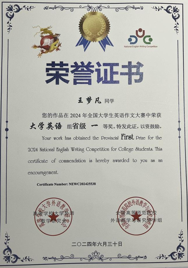 2024年全国大学生英语作文大赛获奖名单日前揭晓,经专家组多轮严格评选,我校2023级新闻学二班王梦凡同学荣获省级一等奖。