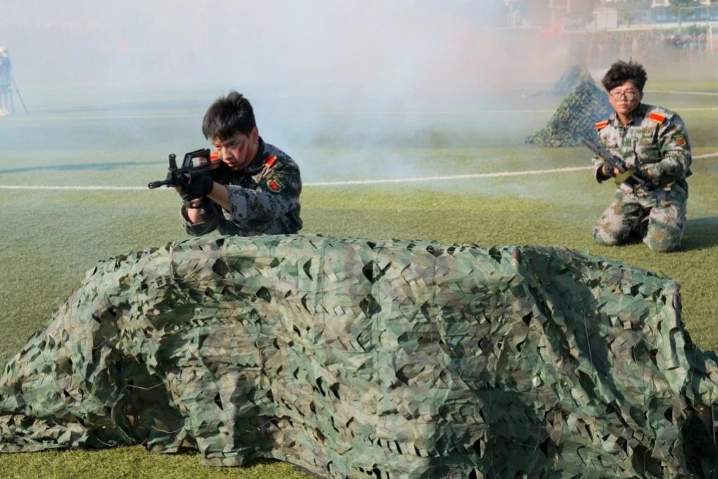 全体参训学生以各连队为单位进行分列式表演。国旗护卫队、尖刀连以及19个连队的2024级学生军容严肃、昂首挺胸,口号响亮、步伐整齐,展现了安艺学子朝气蓬勃、热情饱满的青春风采。女子擒敌拳方队身姿飒爽,气势冲天,擒敌十六动,招招有力;男子战术分队手持步枪、目光坚定,拳影翻飞、脚步沉稳,尽显男儿英雄色;舞蹈方队表演的百人花鼓灯,以舞蹈的形式诠释了刚柔并济,用行动传承中华传统文化。整场汇报演出展示了同学们21天来的训练成果,整齐划一的动作、昂扬的斗志和坚定的眼神,让在场的观众为之动容,纷纷发出热烈的掌声,学生们用实际行动诠释“军训铸魂”的深刻内涵。
