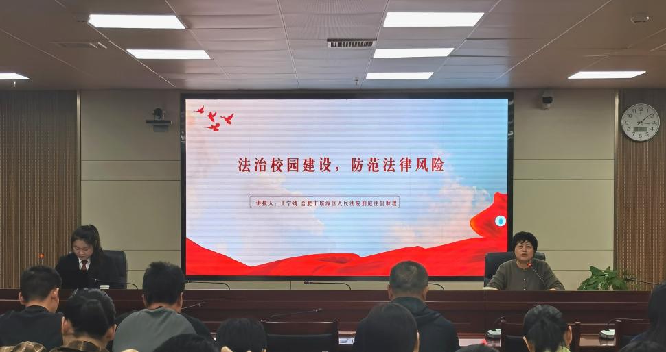 10月14日,合肥市瑶海区人民法院王宁靖法官来我校开展主题为“法治校园建设 防范法律风险”的普法讲座。讲座由学校法治办公室主任吕中华主持。