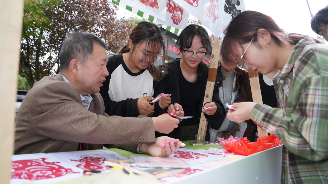本次体验日盛情邀请了十余项非物质文化遗产项目及传承人进行现场展演,黄大茶、六安篮茶、六安瓜片的制作技艺精湛绝伦,庐州制扇则以其独特的匠心工艺吸引了众人的目光。每一项展示都引得师生驻足观赏,赞叹连连。此外,金寨红薯干配山核桃、手工挂面、观音豆腐、手工糍粑等美食的制作技艺,为参与者们奉上了一场味觉与视觉的双重盛宴。在金寨剪纸、大襟服饰制作、庐州篆刻、书法书签制作等互动展台前,师生们热情高涨,纷纷动手尝试,亲身体验传统文化的深厚底蕴与独特魅力。