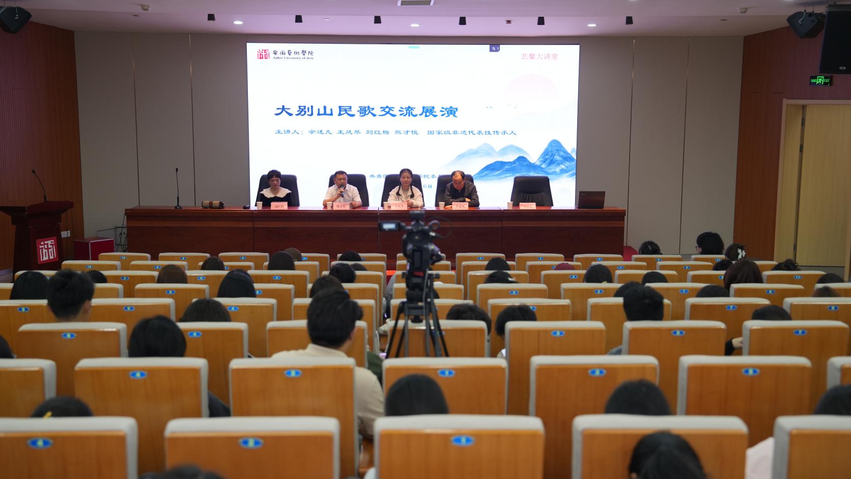 与此同时,美术楼报告厅内,一场别开生面的大别山民歌交流展演如火如荼地进行。国家级、省级非遗传承人余述凡、王凤琴、刘红梅、熊才俊等名家齐聚一堂,现场亲授心得。观众们陶醉其中,掌声连连。展演在大别山民歌代表曲目《八月桂花遍地开》悠扬的曲调中进入高潮,唤起了大家对红色文化的记忆,也让革命精神在当代得到了传承。