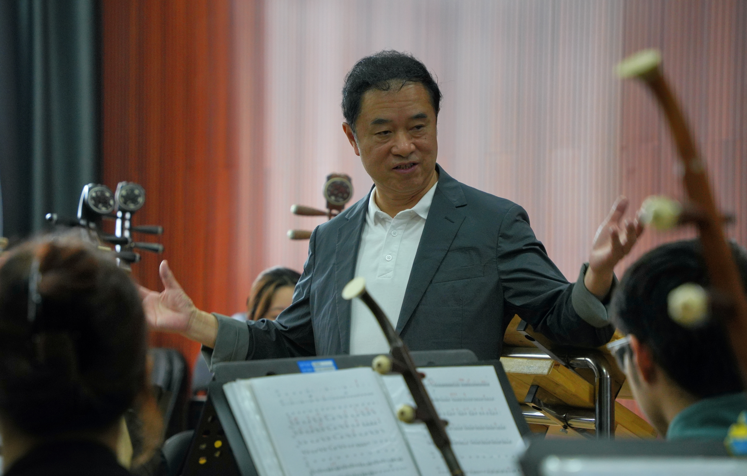 王甫建教授详细讲解了民乐指挥的基本技巧和方法,通过实例和示范,加深了乐团成员对民乐指挥的理解。排练过程中,他耐心指导各声部协作,调整演奏中的声场平衡和音色难题。