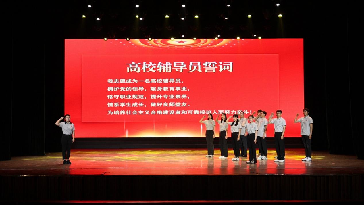 整场仪式由戏剧学院副书记曹磊、安徽省辅导员技能大赛获奖者张高亮、马悦以及校长助理陈欣蕊同学共同主持。全体2024级新生辅导员和学生代表共同演唱《我们的生活充满阳光》,用饱含深情的歌声和鲜活的奋斗场景为观众描绘出高校辅导员同青年大学生共同相处、共同成长的温馨底色。