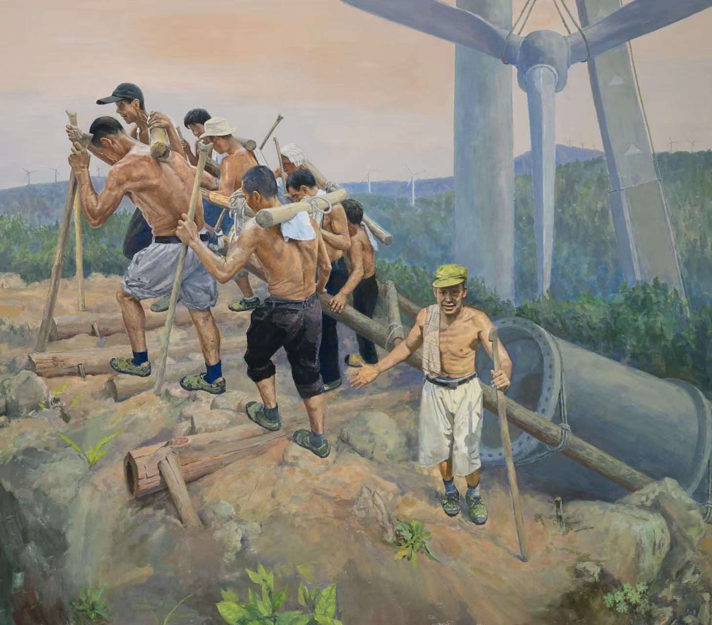 《向云端》作品介绍:画面通过描绘一群民工在险要的山坡上,在现代化的机械设备无法到达的情况下,用人力将沉重的风力发电设备搬运到山顶的场景。反映了我国绿色发展进程中让人难忘的瞬间,描绘了普通人在经济社会发展中的付出和贡献。画面以对角线构图为主,以此来表现强大的上升力量,烘托“向云端”主题。画面右侧背景正在吊装的风车顶天立地,直抵云端,与人群形成强烈的对比,增加了画面的冲击力,同时也是对对角线构图的均衡,进一步烘托了向云端这一主题。