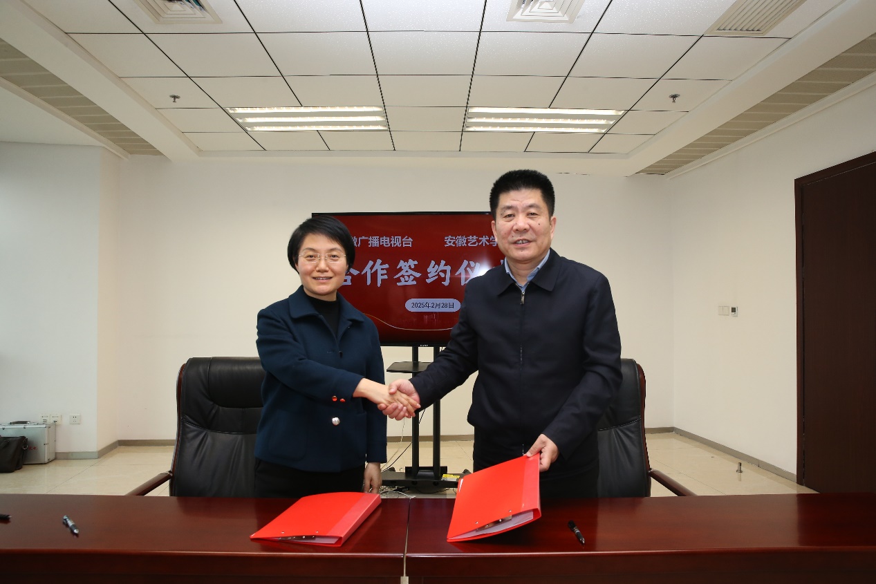 2月28日下午,我校与安徽广播电视台共建实习与就业基地签约仪式在安徽广播电视台顺利举行。这是2021年校媒全面战略合作伙伴关系框架协议签署后,双方的再次延伸合作。校党委书记韩军,安徽广播电视台党委书记、台长、总编辑吴文胜出席仪式。