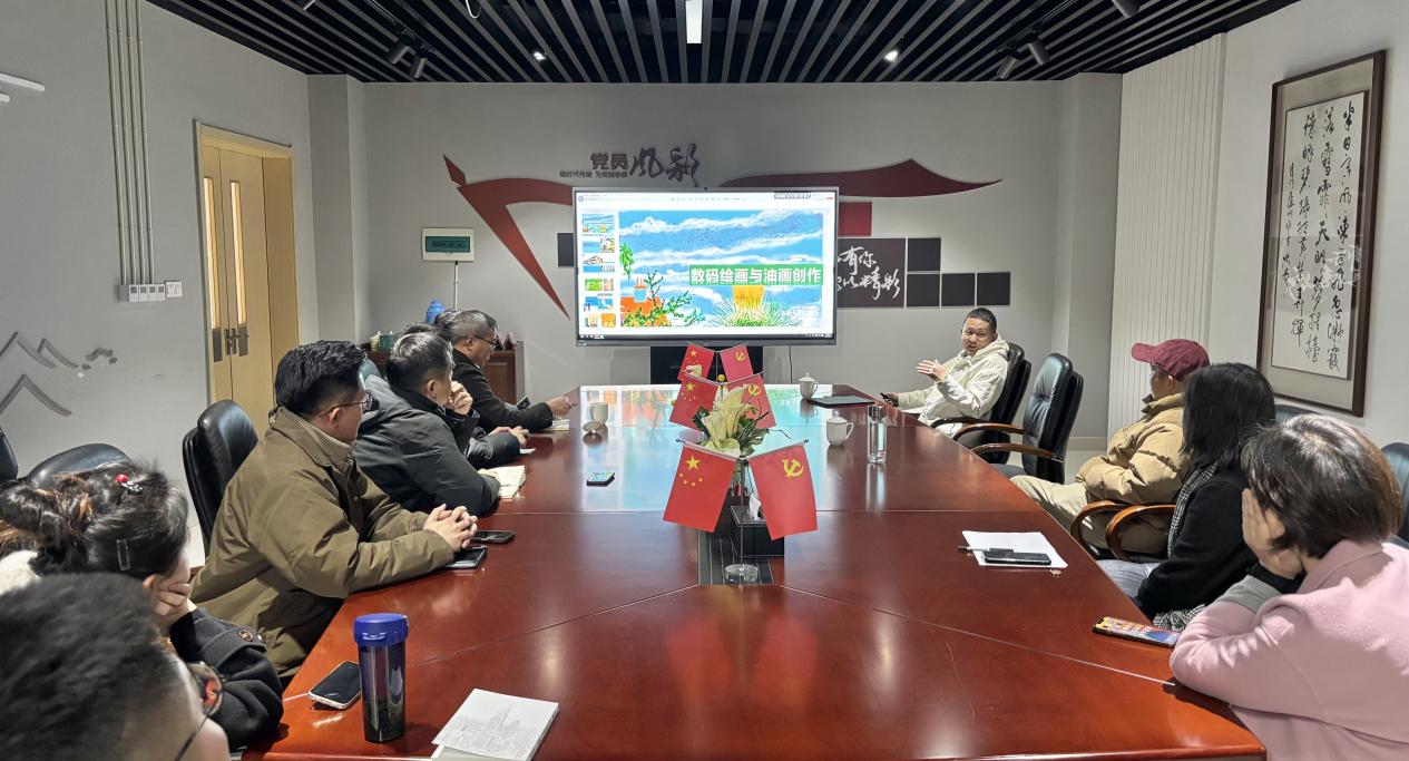 第二场讲座在美术学院314会议室进行。汪鹏飞教授以“数码绘画与油画创作”为题展开研讨。他结合自身创作经验,系统梳理了数字技术介入油画创作的发展脉络,并通过师生作品案例展示,分析数码工具在油画创作表达中的独特优势。讲座现场,他还演示了数码绘画的操作流程,并与在场师生展开交流互动。