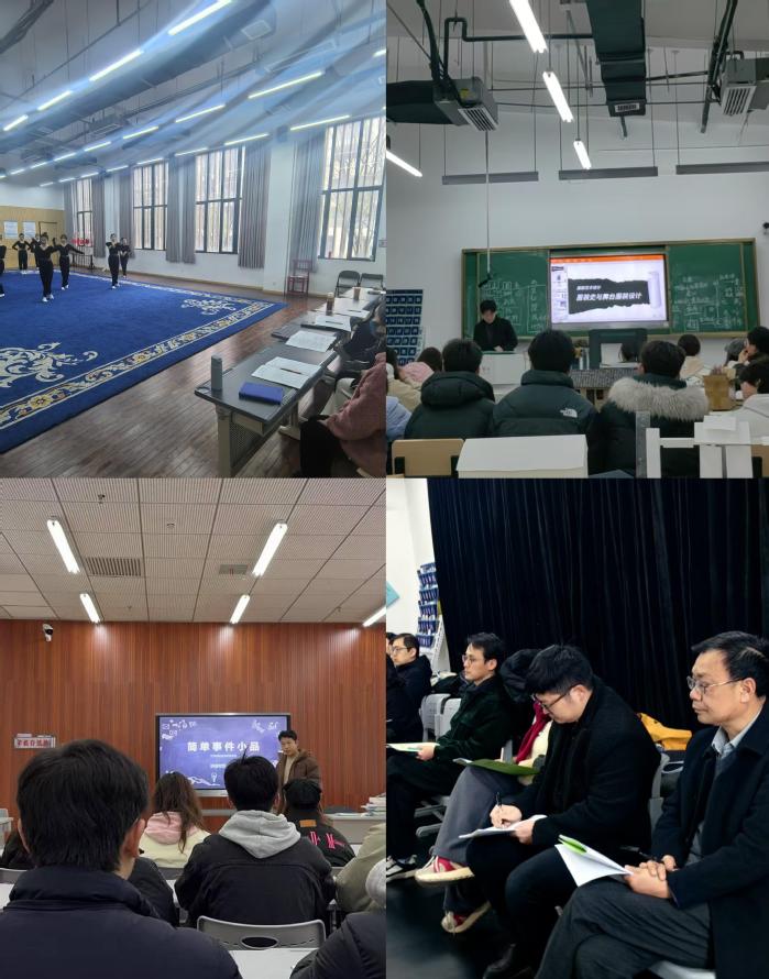 在教学展示环节,戏剧影视文学专业青年教师姚爽以“简单事件小品”为课题,通过“欲、知、能、做”选择模式的讲解,引导学生掌握戏剧小品基本概念和创作规律,课堂讨论氛围热烈;戏曲教研室郁柳老师创新基本功教学,展示把杆组合、身韵组合等技巧训练,配合精准的示范讲解,有效调动学生训练积极性;戏剧影视美术设计专业罗浩林老师开设的《服装设计中的历史文化分析》课程,运用案例教学与比较分析法,系统梳理东西方服装史脉络,引导学生剖析历史文化与服装设计的关联,并针对学生实践中的问题短板提出改进方案;戏剧影视表演教研室杨浩老师以《麦克白》经典台词为切入点,深入解析阐述了悲剧的起源与呼吸机制,帮助同学们理解好的台词应当“听见、听懂、好听”。