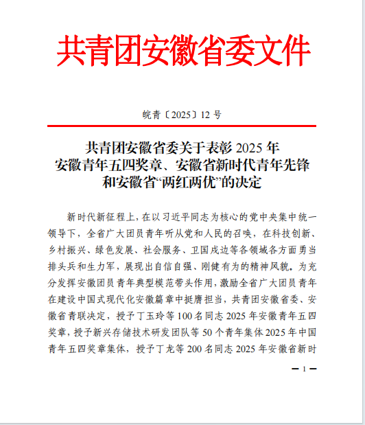 近日,共青团安徽省委印发《关于表彰2025年安徽青年五四奖章、安徽省新时代青年先锋和安徽省“两红两优”的决定》,我校团委凭借扎实的工作成效与创新实践,荣获“安徽省五四红旗团委”称号,这是我校首次获此殊荣。