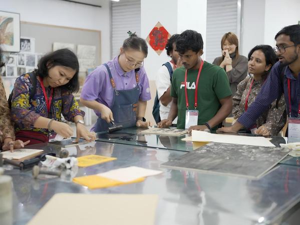 代表团成员们积极参与体验,亲手尝试了版画制作、中国画绘制和书法创作,切身感受了中国传统艺术的深厚底蕴。在参观过程中,代表团成员深入了解了乐动网官网在传统艺术传承与创新方面的成果,并对学院在专业建设、艺术教育方面取得的成就表示赞赏。