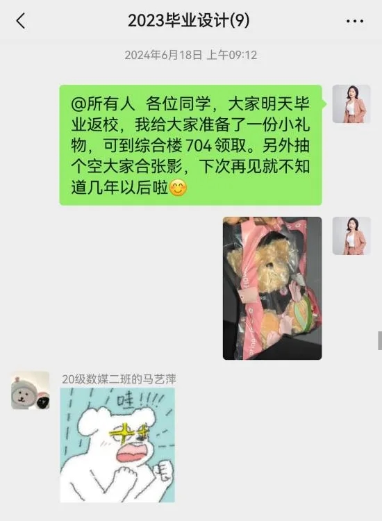 这些看似简单的礼物,早已超越了物质本身的意义。它们像一座座无形的桥梁,将师生的情感紧密相连;又如一盏盏温暖的明灯,照亮毕业生们前行的道路。2025届杜家宜、王嗣等同学收到的杜邦纸书包,2024届马艺萍、王静洁等同学收到的小熊,2021届殷俊、任仪等同学收到的明信片、标签、书本,都是这份教育情怀的最好见证。正如杜家宜同学所说,离校时带走的不仅是知识,还有被珍视的幸福感——这大概就是母校最好的“设计作品”。