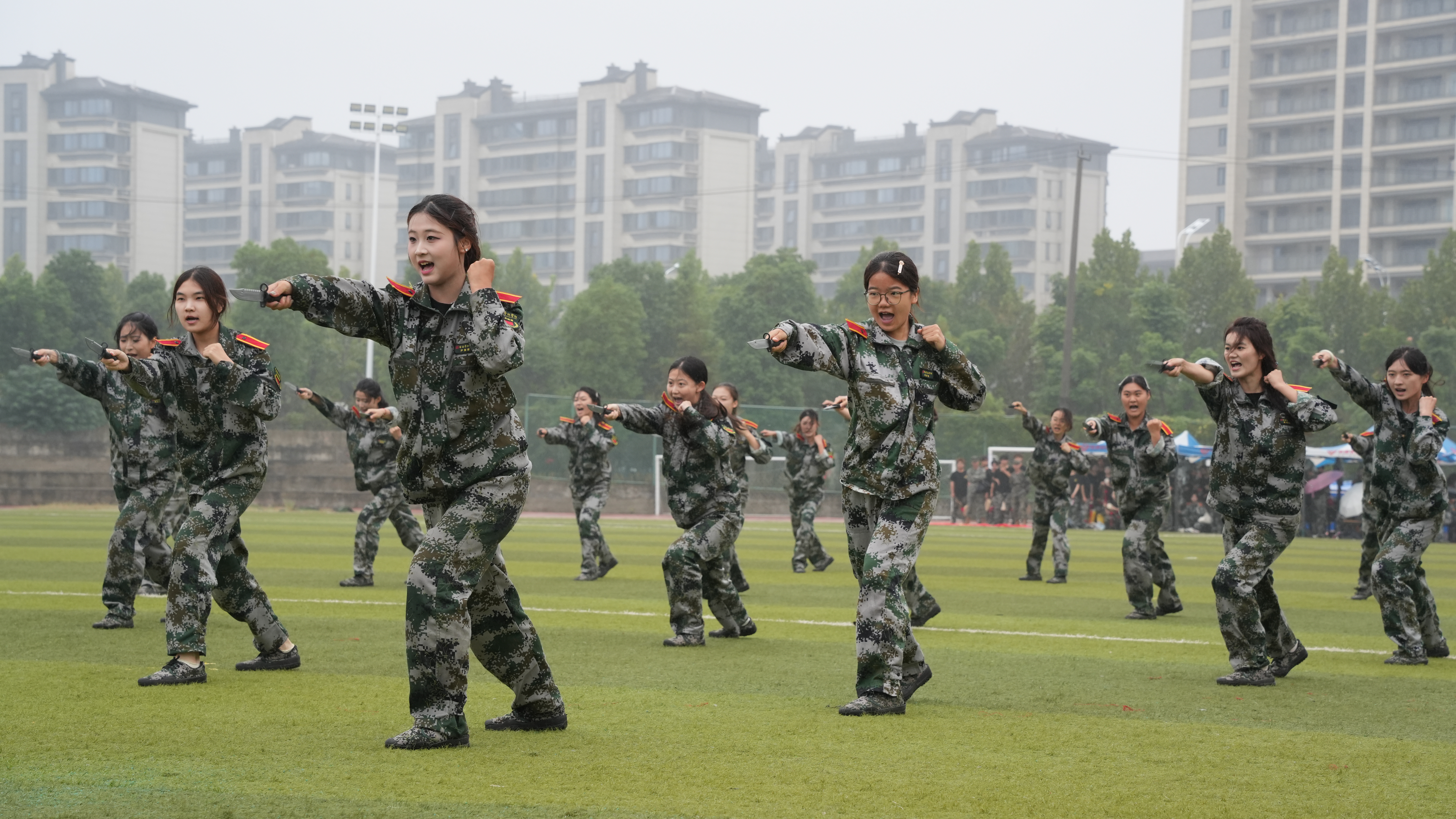分列式结束后,军事科目与文艺汇报表演精彩上演。音乐学院师生倾情合唱《艺心向阳》《向往》,歌声铿锵有力又饱含热忱,以青春旋律传递我校艺术特色;女子匕首操方队出刀迅猛、踢腿刚劲,动作精准利落、气势如虹,展现“巾帼不让须眉”的飒爽;男子战术分队模拟真实战场,依托掩体快速跃进、协同搜索、交替掩护,动作敏捷、配合默契,凸显扎实战术基础;舞蹈学院群舞《鼓舞江淮》以鼓为魂、以舞传情,激昂鼓点搭配豪迈舞姿,生动展示青春力量。