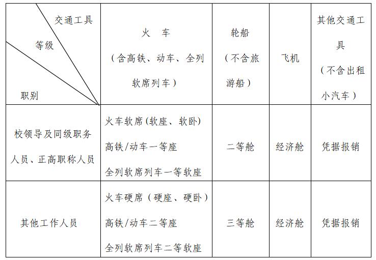 第十条 出差人员要严格按照规定等级乘坐交通工具,凭据报销城市(城乡)间交通费。不得租车作为城际交通工具。出差人员乘坐交通工具等级如下: