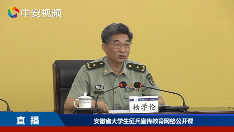全省大学生征兵宣传教育网络公开课由安徽省人民政府征兵办公室、省教育厅联合主办,邀请了安徽省军区副政治委员杨学伦做主题演讲。围绕“国家兴亡匹夫有责,携笔从戎不负韶华”这一主题,安徽省军区副政治委员杨学伦从安全形势、家国情怀、安徽荣耀、军旅圆梦四个方面,与大学生们分享了自己三十多年的部队的生活、感受和思考。演讲结束前,他向全省大学生发出郑重邀请。杨学伦:“当代大学生是天之骄子,有爱国情怀,有专业知识,他们有创新创造的激情,部队特别需要。相信他们来到以后,经过艰苦的、严格的训练,一定会成人成才,在各个岗位发挥他们的最大作用。欢迎他们来到部队。”