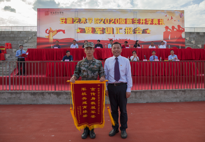 军训学生代表2020级数字媒体艺术专业的李昕瑜、2020级播音主持专业的杨宏涛分享了军训的收获,表达了对教官的敬意,表示会将军训中领悟到的精神投入到未来的学习生活中,力争做到校训所言的“知行合一,德艺双馨”。