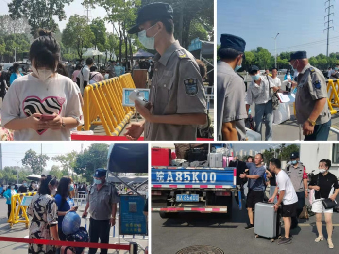 学校北门,我校保卫处防疫执勤人员认真做好防疫迎新工作,对新生进行身份核对,引导学生扫安康码,出示14天内的行程记录,测量体温,确保无误后允许新生进入校园。
