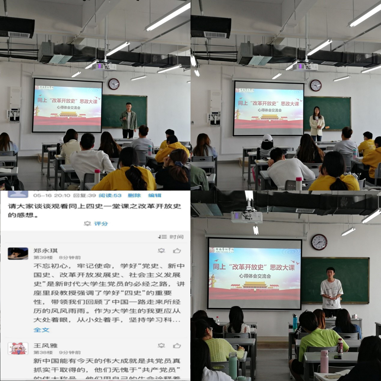 根据学校宣传部和学工部统一安排,各系于5月15日组织全体学生、辅导员和思政课教师通过网络平台在寝室、教室和家里分收看了改革开放史思政大课。5月16日—17日,马克思主义学院教师以班级为单位,围绕课程内容,组织学生开展了线上线下相结合的学习研讨活动。