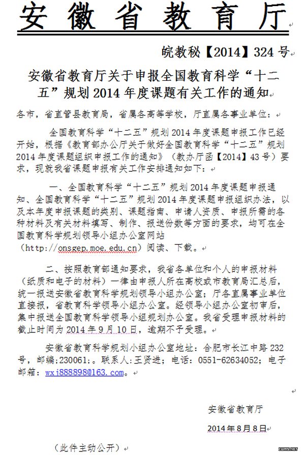 全国教育科学”十二五”规划2014年度课题申报工作已经开始,请有意申报者登录网址http://onsgep.moe.edu.cn阅读相关申报条件,下载申报表格。申报材料上报学院的时间为2014年9月1日至9月5日,纸质材料及电子档请送交李伟老师处。邮箱地址:liwei91919689@126.com,手机号码:13855187718 。