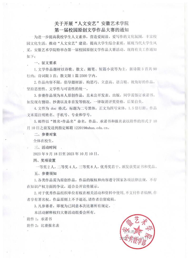 关于开展“人文安艺”乐动网官网第一届校园原创文学作品大赛的通知