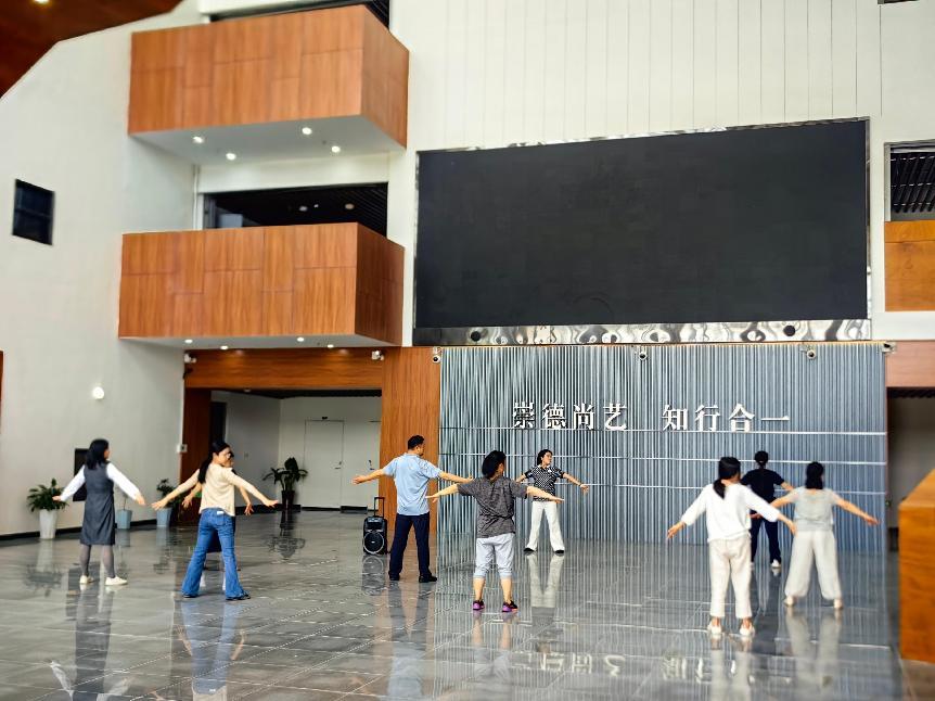 在舞蹈学院调研中,张井水结合体育专员赵倩倩的特长,从学校网球队队员选拔和日常训练角度,进行了对接和交流。其他五个学院分别重点发展篮球、跆拳道、武术、乒乓球和足球等体育项目。在机关总支调研中,详细了解了教职工体育锻炼活动的开展,彭乾姿、史梦雪两位体育专员发挥专业特长,带领部分教职工进行了八段锦工间操的学习。