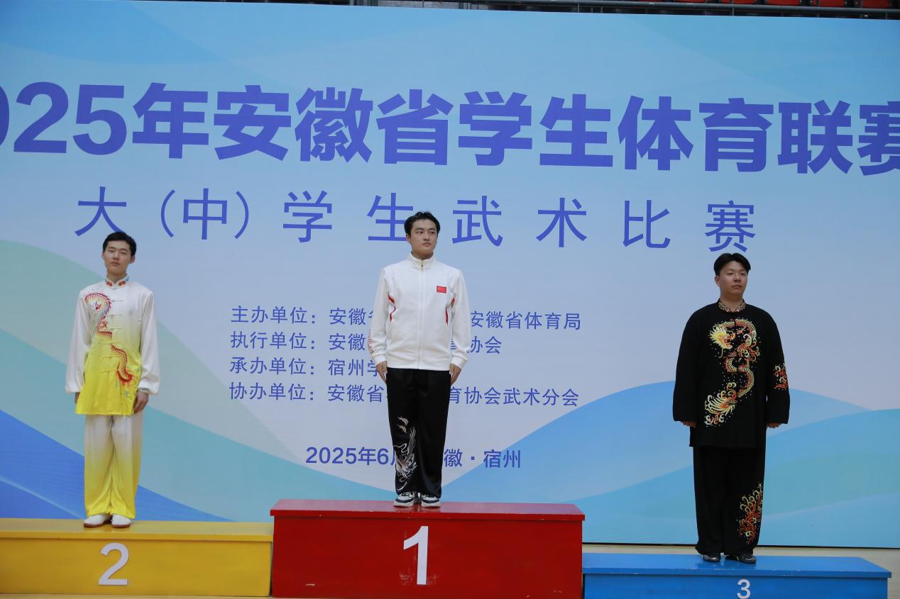 6月18-22日,安徽省学生体育联赛大学生武术比赛在宿州市举行。本次比赛由安徽省教育厅、省体育局联合主办,宿州学院承办,吸引了全省各高校45个代表队,共245余名运动员参与,我校王秋实在男子甲组太极剑项目中获得第三名(二等奖)。