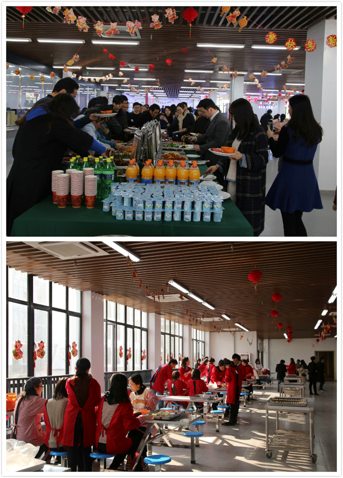 虽是四九时节,新食堂里却暖意融融,处处洋溢着祥和喜庆的节日氛围。食堂门口,大红灯笼高高挂起,“春”“福”字烘托中国年味,“放飞新希望·整装再出发”的标语耀眼夺目,欢声笑语中传递新春喜庆,祝福问候里共话未来发展。
