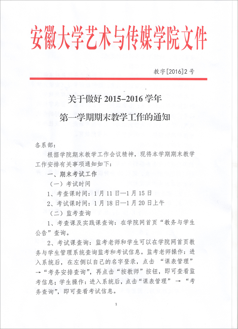 关于做好2015-2016学年第一学期期末教学工作的通知
