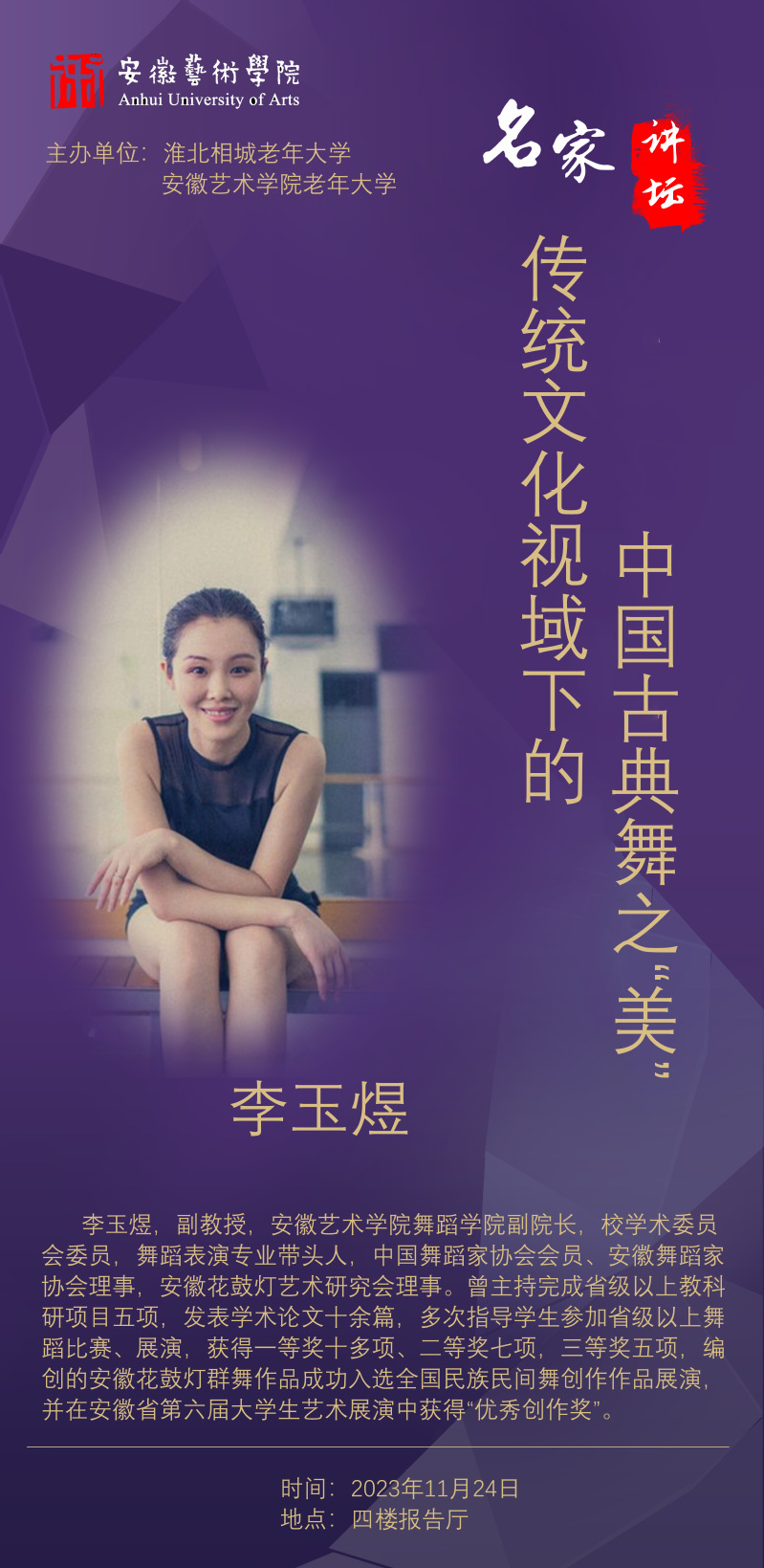 李玉煜教授以《传统文化视域下的中国古典舞之“美”》为主题,从形、神、劲、律四个方面向学员们讲解了中国古典舞的审美法则,其中“形”指舞姿外部的特征;“神”指对舞蹈内涵的把握;“劲”指舞者节奏和力度的运用;“律”指舞蹈和规律的习惯。