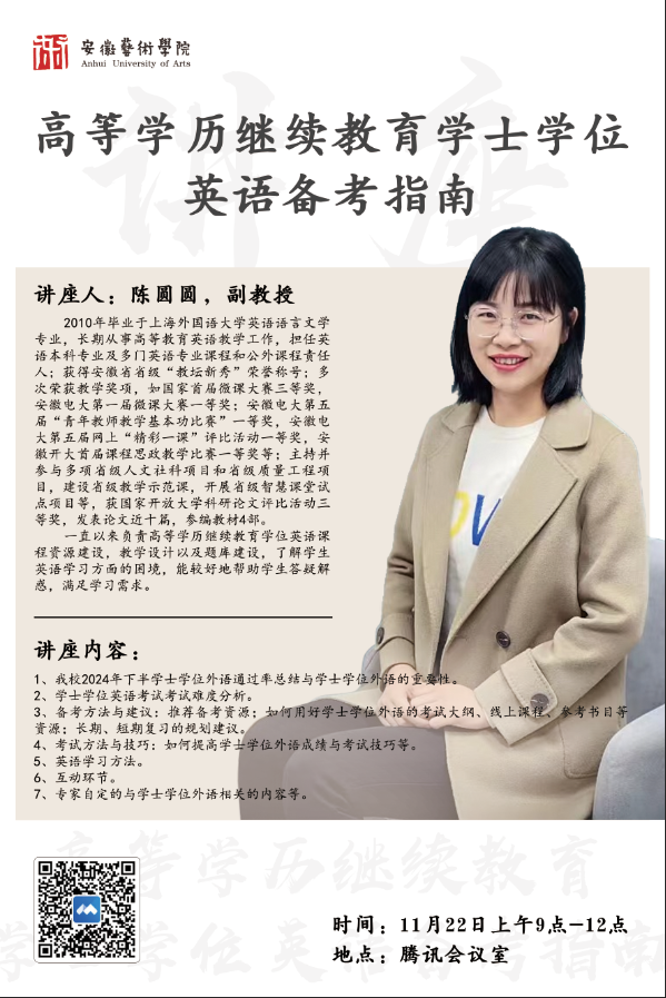 11月22日,继续教育学院邀请安徽开放大学陈圆圆副教授开展了题为《高等学历继续教育学士学位英语备考指南》的线上讲座,继续教育学院副院长阚侃出席,全院近200名师生参加了本次讲座。