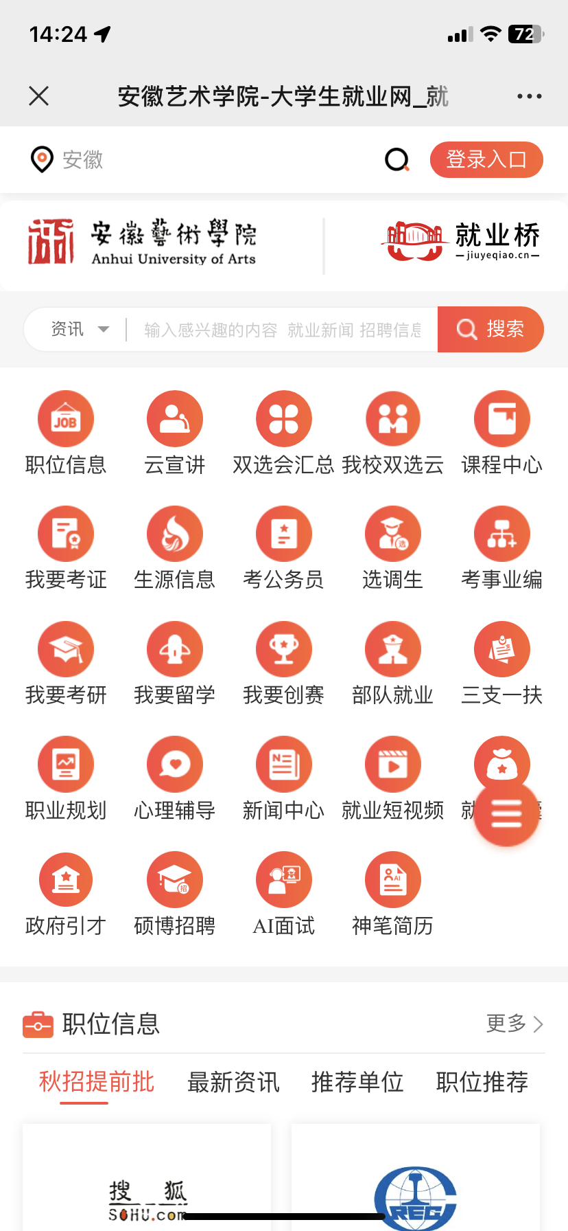就业桥涵盖“职位信息”“云宣讲”“我校双选云”“我要考证”“考公务员”“考事业编”“我要留学”“三支一扶”“专升本” “神笔简历”“职业规划”“心理辅导”“新闻中心”“就业短视频”等内容模块,全方面覆盖生涯发展板块,为广大学生的毕业去向保驾护航。