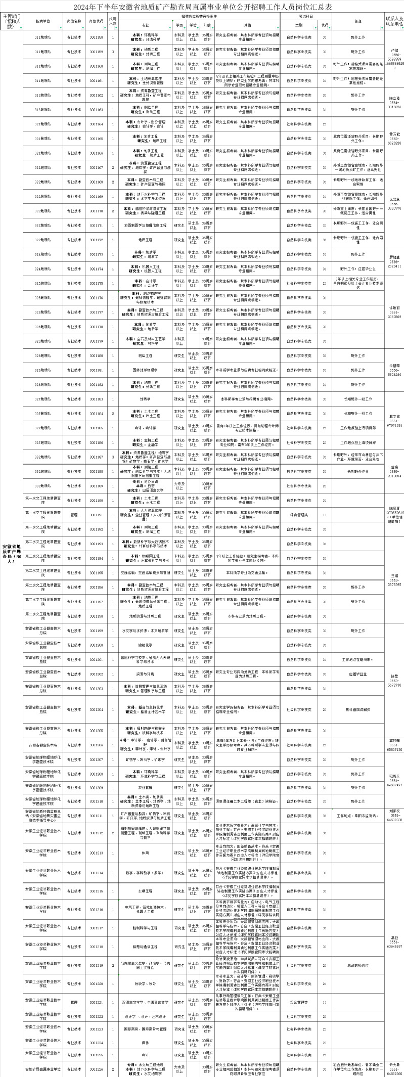 根据《事业单位人事管理条例》(国务院令第652号)和中共安徽省委组织部、安徽省人力资源社会保障厅《关于印发〈安徽省事业单位公开招聘人员暂行办法〉的通知》(皖人社发〔2010〕78号)规定和要求,现就2024年下半年省地质矿产勘查局直属事业单位公开招聘工作人员有关工作公告如下。