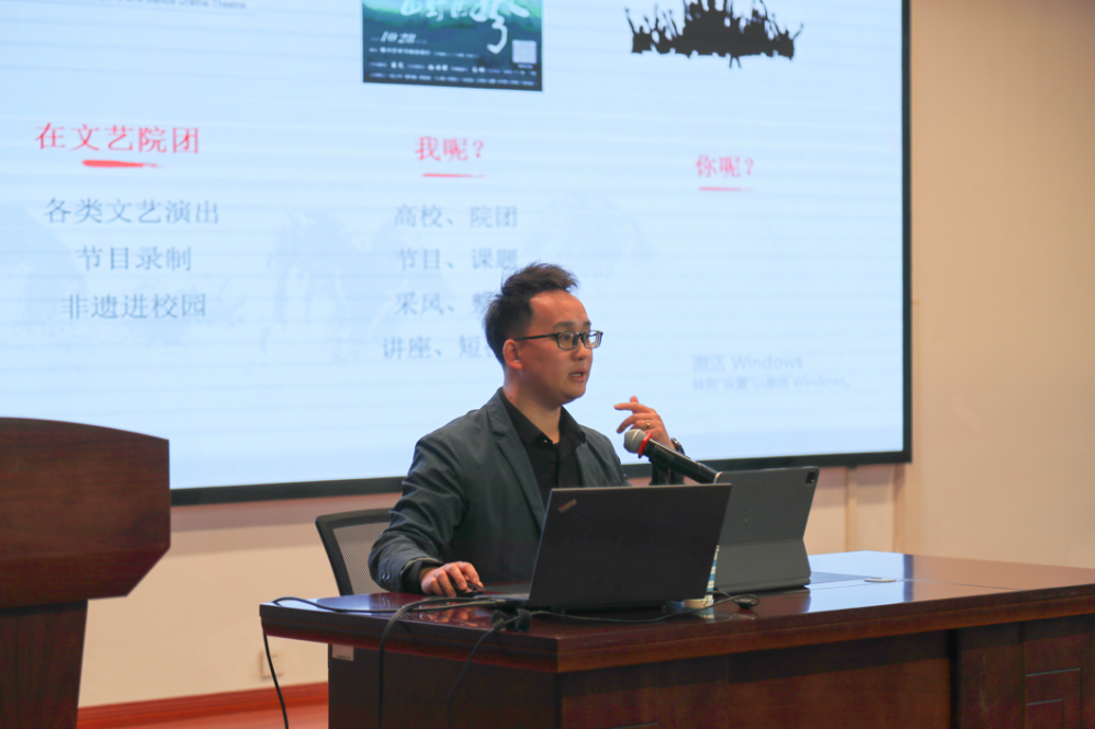 讲座围绕“基于校企合作的民族技艺人才培养”主题展开,蒋涛从民歌的定义、民歌与民族声乐、传承民歌的意义以及传承方式四个方面进行了深入浅出的讲解。他结合自身艺术实践,以生动的案例和优美的歌声,带领同学们领略了安徽民歌的独特魅力,阐释了民歌作为民族文化瑰宝的重要价值。