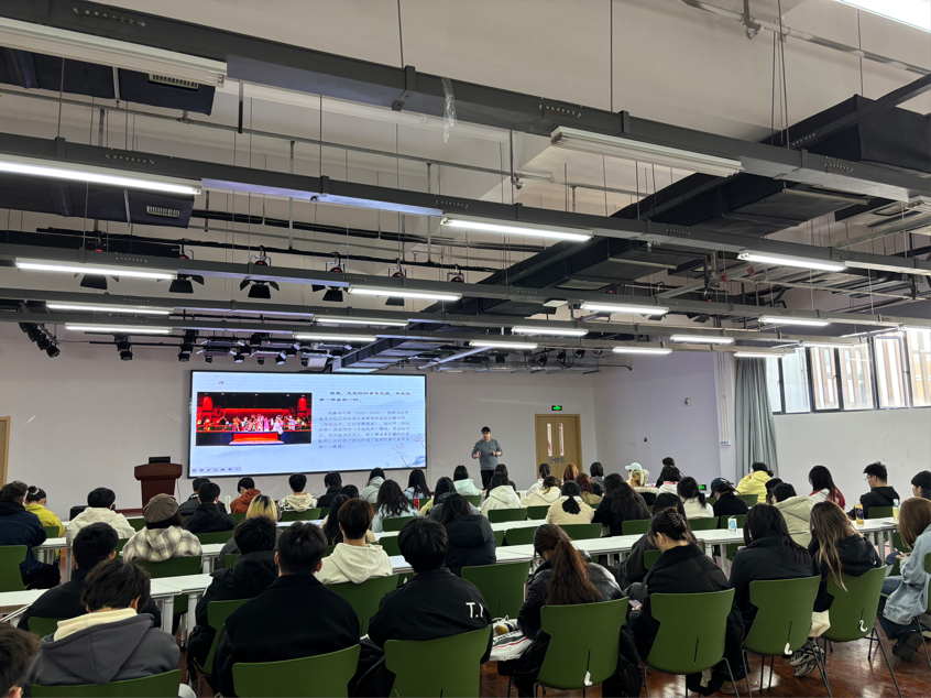 潘捷首先向在场的同学们介绍了“徽昆”形成的历史。并展示了明末清初的石刻《白兔记》和《七擒孟获》图片。中华优秀传统文化是中华民族的精神命脉,而徽文化作为中华优秀传统文化的璀璨明珠,承载着千年历史积淀与地域特色,其精神内核与物质遗产至今深刻影响着徽州地区的社会生活与文化传承。现场,潘捷还向同学们分享了他在黄山市歙县许村以及屯溪区拍摄的当地风土人情照片,让现场的青年学子直观感受到了徽州文化基因与昆曲艺术魅力。