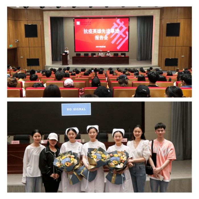 在报告会上,沈杭、袁净、刘丁丁先后用朴实生动的语言生动地讲述了她们“逆行”出征,在武汉与全国医护人员一起并肩战斗的经历,与师生们分享在武汉金银潭医院抗疫最前线的所见、所闻、所感。