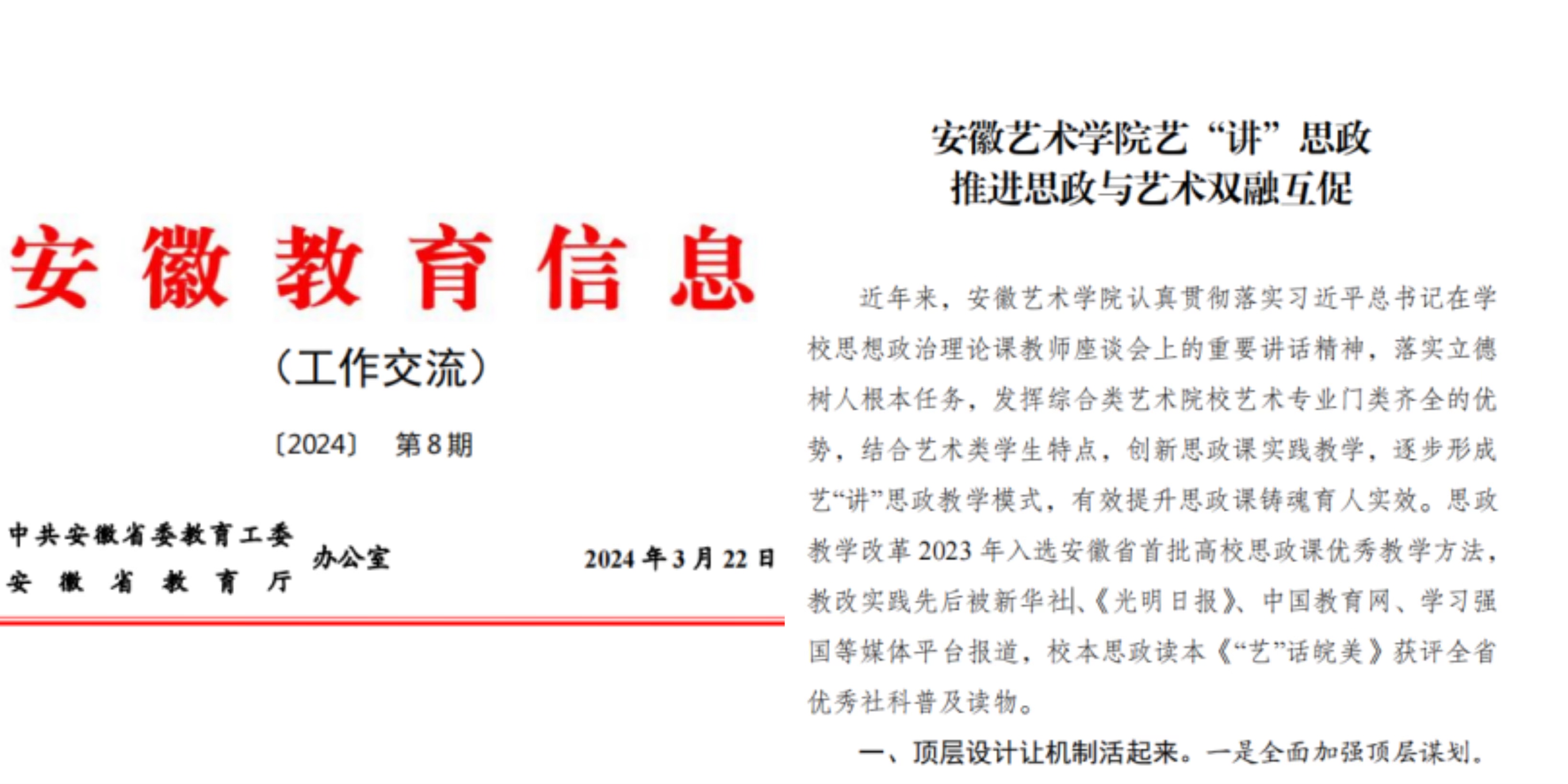 近日,由省委教育工委、省教育厅编印的《安徽教育信息》在2024年第8期以《乐动网官网艺“讲”思政推进思政与艺术双融互促》为题,专题报道了我校艺“讲”思政教学方法。