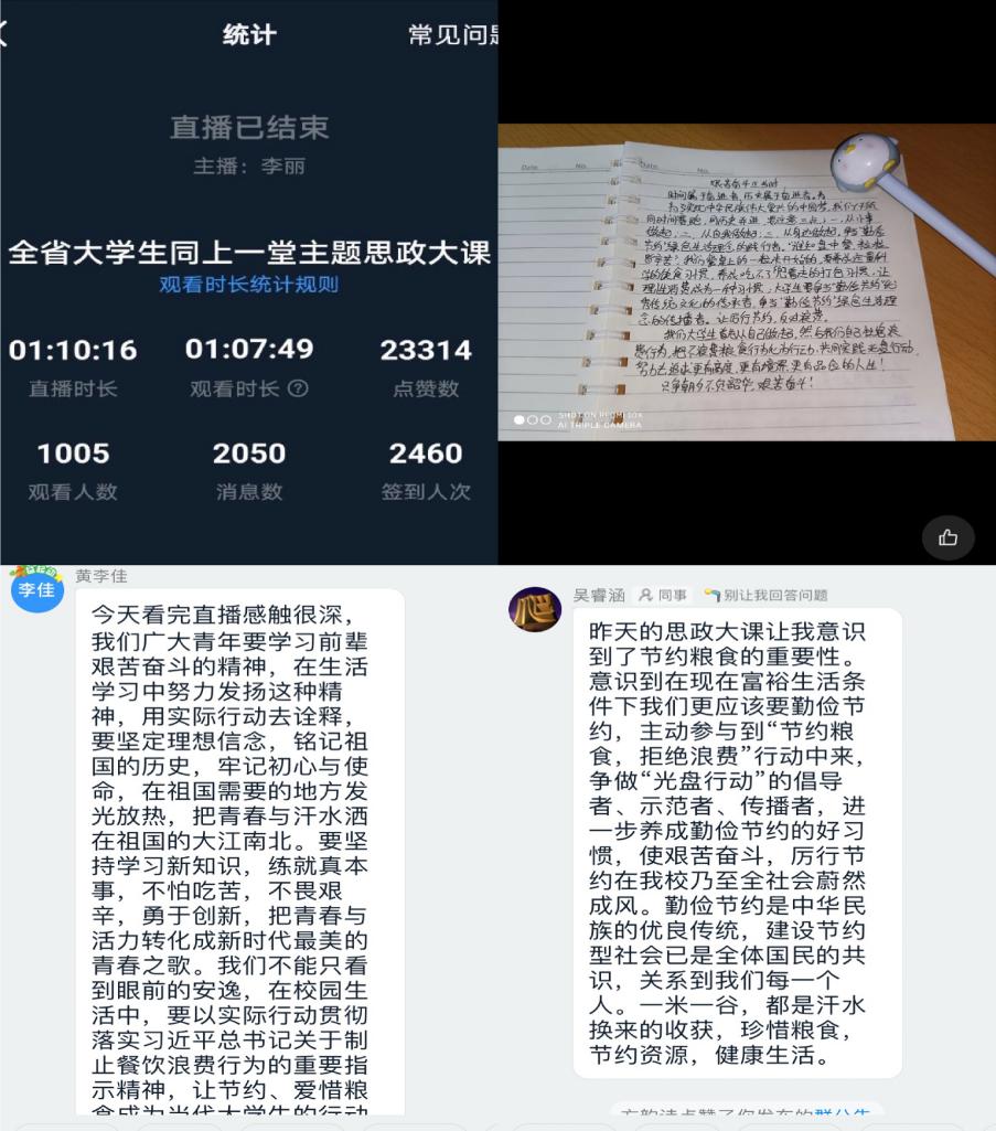 在课堂上同学们展开了热烈的线上讨论,课后也在群内针对“节约”发表自己的看法。作为当代新青年,提高思想认识的同时更应主动担起社会责任。同学们纷纷表示,国家的发展,需要我们每一个公民的努力,我们每个人要成为勤俭节约风尚的传播者,实践者,示范者。(撰稿:韩欣盈 初审:王亚鹏 复审:李卫国 终审:罗耀东)