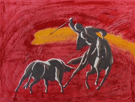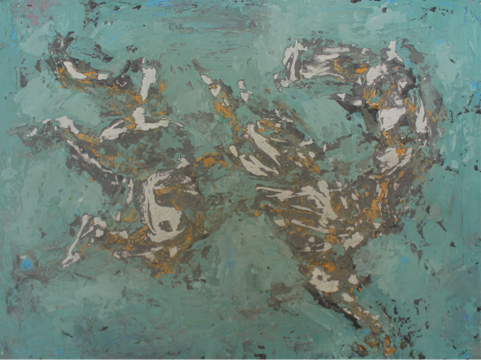 技法、制作过程:首先要在画板上画出马的形象,再用腻子粉加适当白乳胶和水,勾兑出浓稠度合适的腻子粉,有节奏的填充在马的型上,使之有立体感。然后用黑色颜料铺上底色,可以等它不完全干透的时候铺上最终想要的颜色,这样黑色也能够隐隐约约透出来,增加画面层次感。然后用砂纸打磨马身,使原始的腻子粉本色显露出来,勾勒马身,丰富画面。